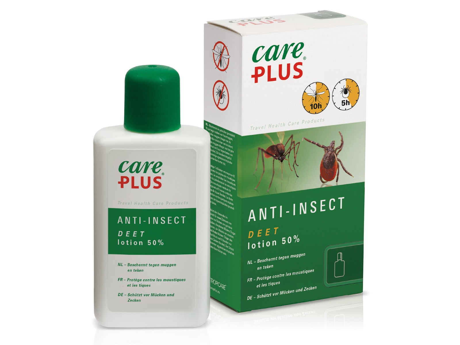 Im Medizinschrank und der Reiseapotheke darf ein guter Mückenschutz nicht fehlen. Also nicht vergessen, vor den ersten Stichen (!) ein Insektenschutzmittel zu kaufen. Ein Insektenstich ist nicht nur ärgerlich, sondern kann auch zu ernsthaften gesundheitlichen Problemen führen. Insekten können Krankheiten wie Malaria, Denguefieber und Gelbfieger übertragen. Ein Zeckenbiss kann die Lyme-Krankheit verursachen. Gründe genug, um sich optimal gegen Insektenstiche und -bisse zu schützen! Die Anti-Insektenlotion DEET 50% (Diethyltoluamid) ist das wirksamste Mittel im Sortiment von Care Plus gegen Mücken, Zecken und andere Insekten. Sie schützt bis zu 10 Stunden gegen Mücken und bis zu fünf Stunden gegen Zecken. Verwenden Sie die Anti-Insektenlotion DEET 50%, um unbedeckte Haut einzureiben. Bei gleichzeitiger Verwendung eines Sonnenschutzmittels nehmen Sie dieses zuerst (30 Minuten bevor Sie in die Sonne gehen) und dann 20 Minuten später die Lotion DEET 50%. Ihre Haut ist so optimal geschützt. Die Lotion reicht für eine Person bei täglichem Gebrauch zirka 10 Tage.