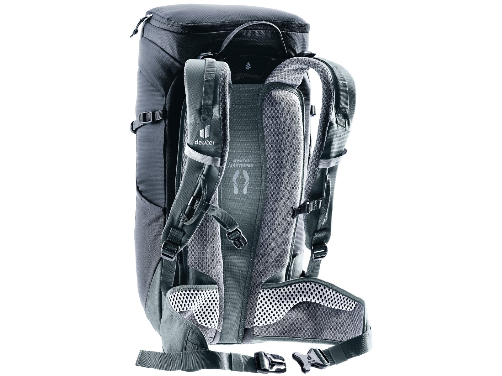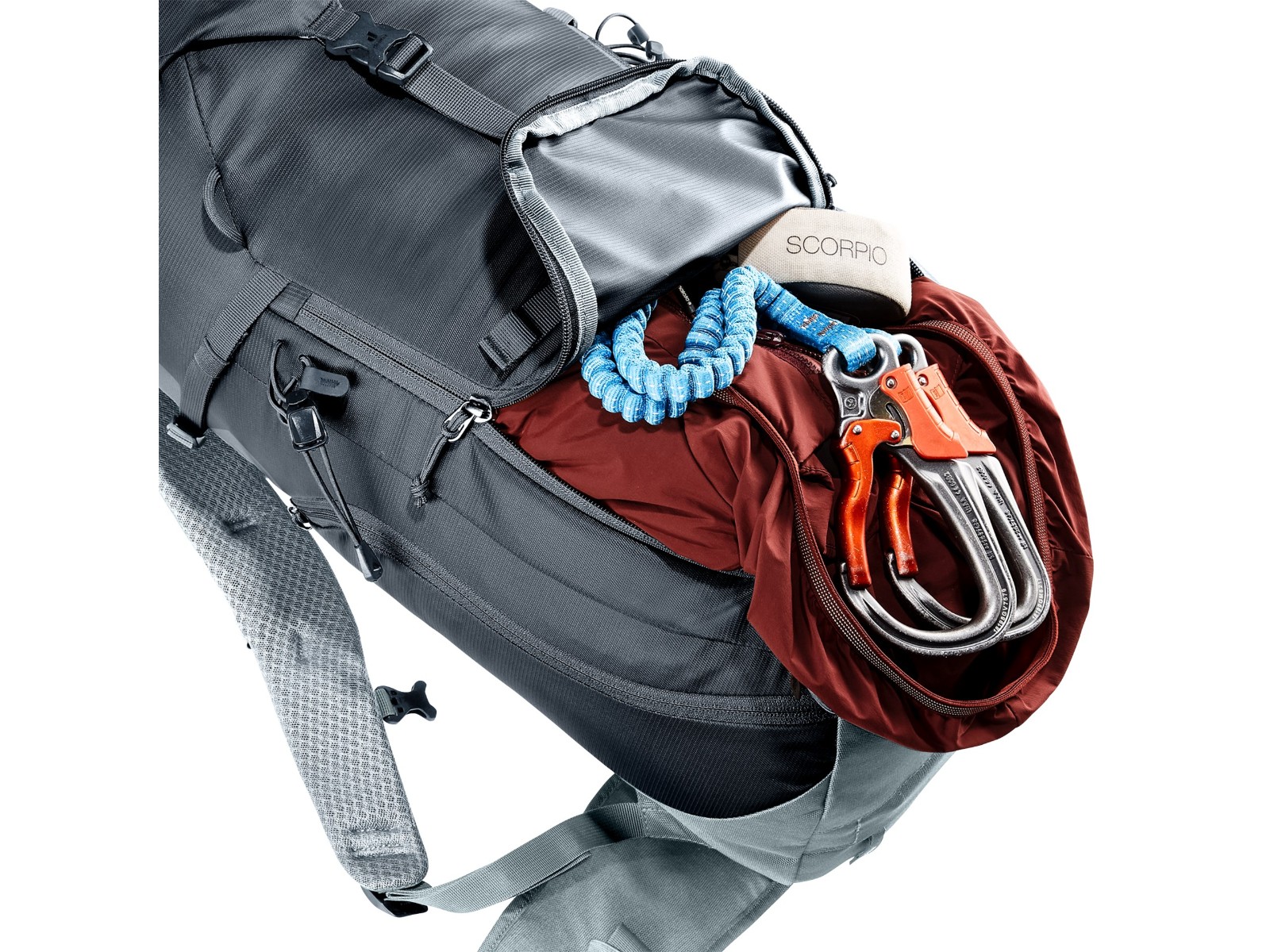 Leichter, universell einsetzbarer Tages-/Tourenrucksack: Das Airstripes Rückensystem mit geringer Rückenauflage und großen Belüftungskanälen sowie die ergonomischen Schulterträger und Hüftflossen sorgen für optimale Luftzirkulation, körpernahe Gewichtsverteilung und damit einen kompakten Sitz in jedem Terrain. Die flache Deckelkonstruktion bietet gute Kopffreiheit – auch mit Helm. Dank Fixierungen an den Schulterträgern sind die Karabiner des Klettersteigsets stets griffbereit. Zudem sind Ausrüstungsgegenstände und Material dank großem Reißverschluss-Frontzugang und Seitentaschen schnell zur Hand.