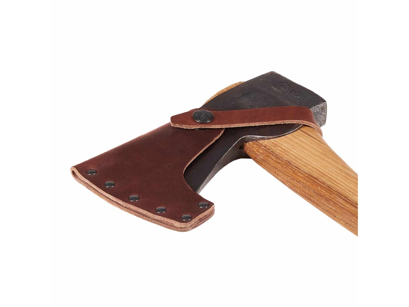 Geschützt wird der Axtkopf in einer pflanzlich gegerbten Lederscheide.