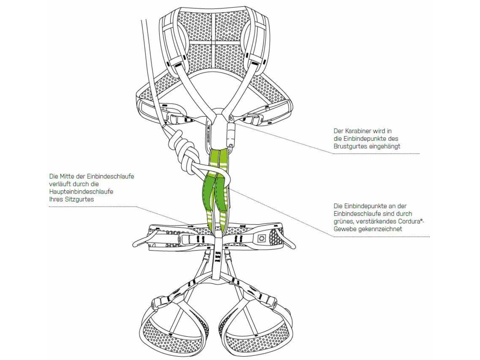 Einbindeschlinge zum sicheren Einbinden in Hüftgurt und Brustgurt. Das Tie-in Sling PA 20 mm von OCUN garantiert eine Zugfestigkeit von 22 kN für die gesamte Schlinge in jeder Schlaufe. Die Einbindepunkte an dem Gurtband sind durch grünes, verstärkendes Cordura®-Gewebe gekennzeichnet, sodass nichts verwechselt werden kann. Zum Anbringen der Selbstsicherung verläuft die Mitte des Tie-in Sling PA 20 mm von OCUN durch die Haupteinbindeschlaufe deines Sitzgurtes. Der Karabiner (nicht im Lieferumfang enthalten) wird an den oberen beiden Einbindepunkten des Gurtbandes hindurch gefädelt und am Brustgurt eingehängt.