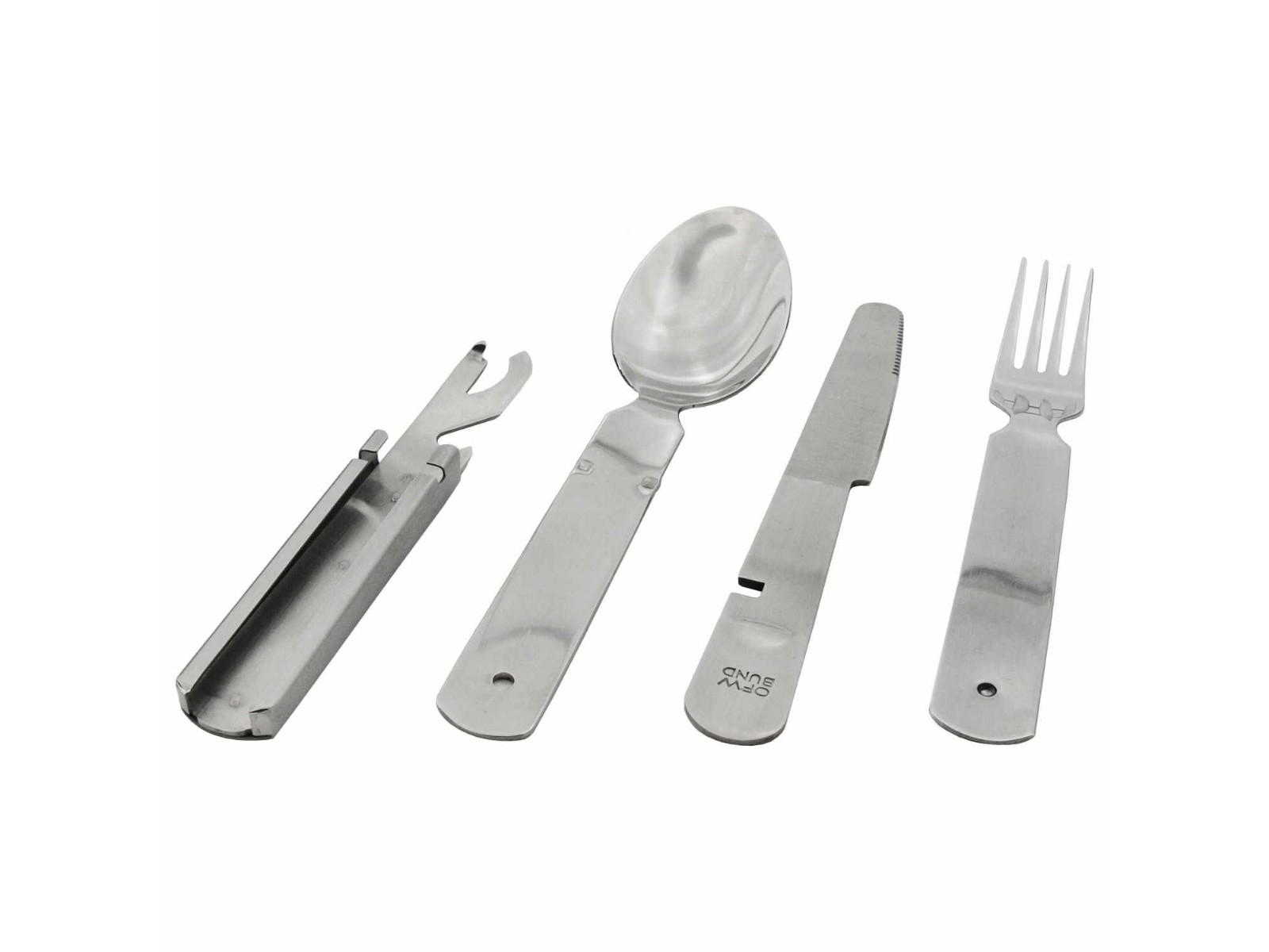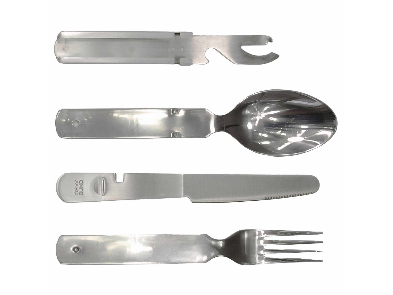 Das wirkliche Original (ohne den Adler) hergestellt in den Formen von Otto Förster Wupperthal (OFW). OFW war lange Zeit Erstausrüster der Bundeswehr. In der Qualität nach wie vor unübertroffen und sehr sauber verarbeitet. Mit schnitthaltigem Messer, Dosen- und Flaschenöffner, Gabel und Löffel. Es ist sehr stabil und kompakt zu verstauen, rostfrei, im praktischen Neoprenetui.