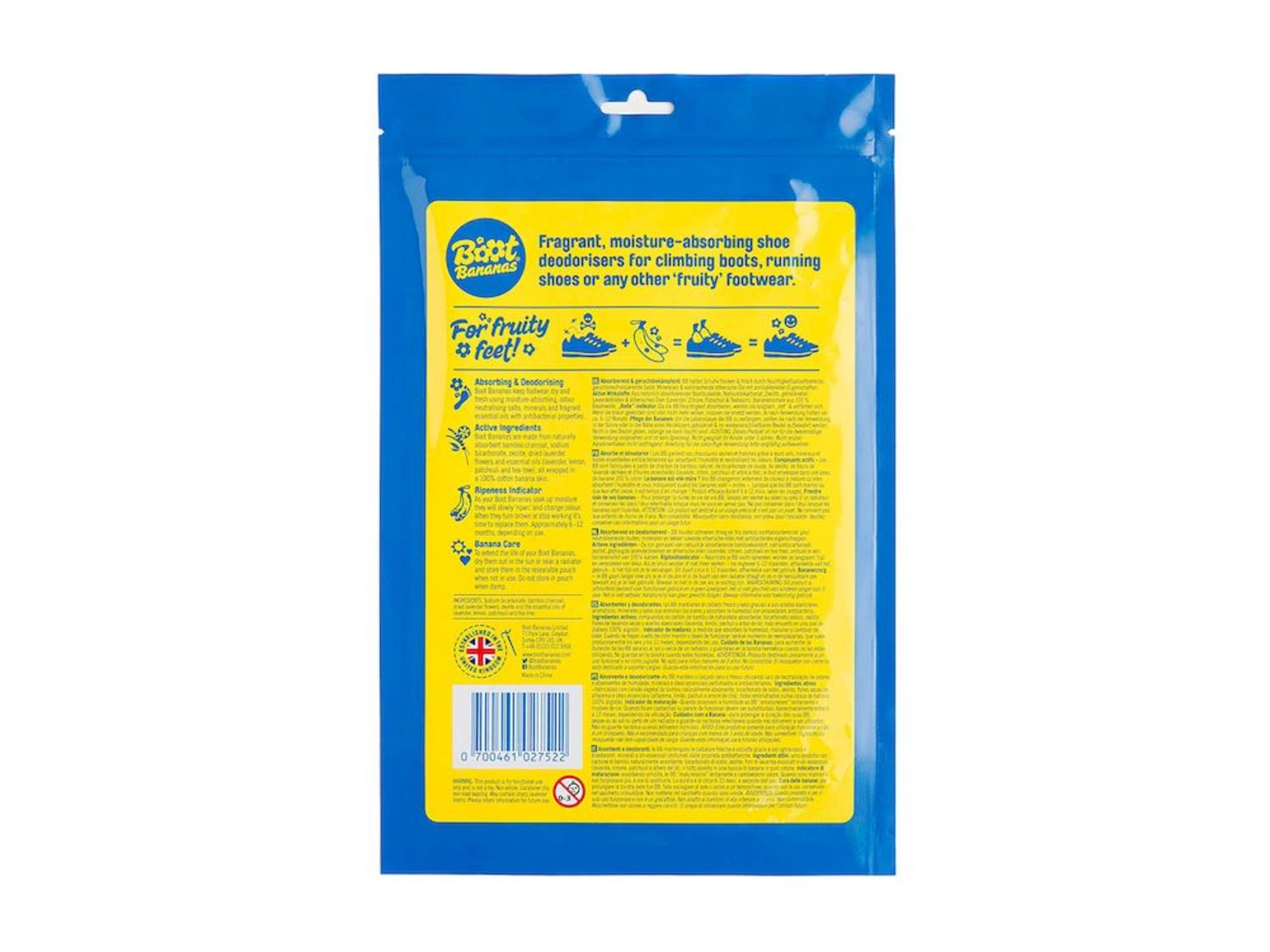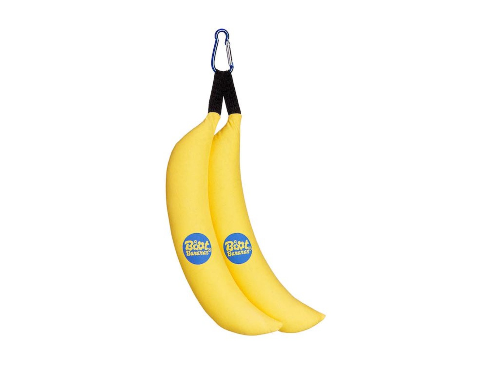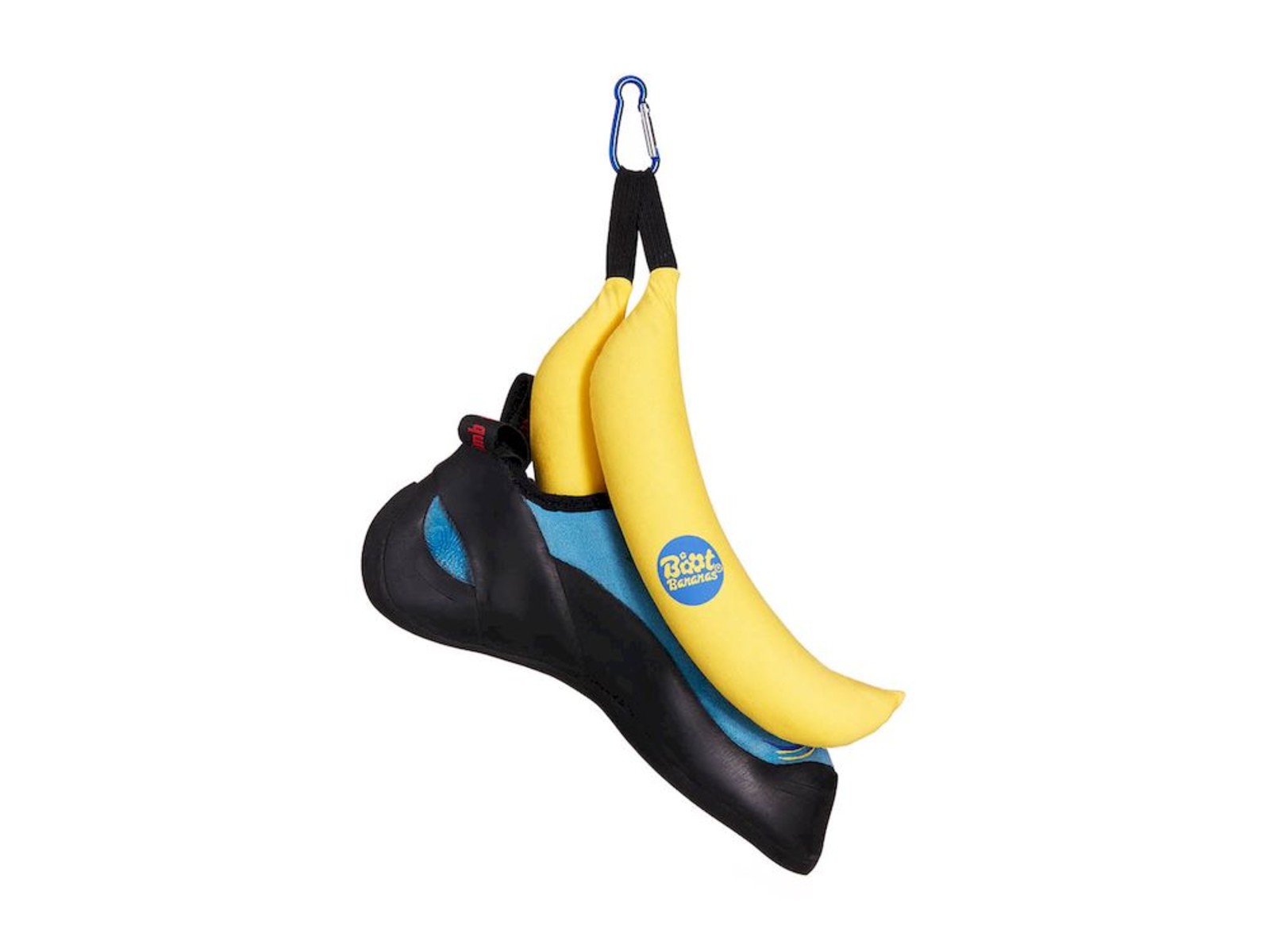 Duftende und feuchtigkeitsabsorbierende Schuhdesodorierer für Kletterschuhe, Laufschuhe oder andere "fruchtige" Schuhe. Boot Bananas werden aus natürlich absorbierenden Salzen, Mineralien und Pflanzenextrakten mit ätherischen Ölen aus Lavendel, Zitrone, Patchouli und Teebaum hergestellt, die in eine Bananenschale aus 100 % Baumwolle eingewickelt sind. Die Bananen einfach nch der Benutzung in die Schuhe stecken. Für die optimale Leistung am besten schon bei neuen Sportschuhen damit anfangen, um die Geruchsbildung von Anfang an zu verhindern. Die Deo-Bananen bleiben auch dann noch wirksam, wenn sie leicht braun geworden sind, aber dadurch zeigt sich wie "reif die Bananen sind!" – also wieviel Feuchtigkeit sie aufgenommen haben.