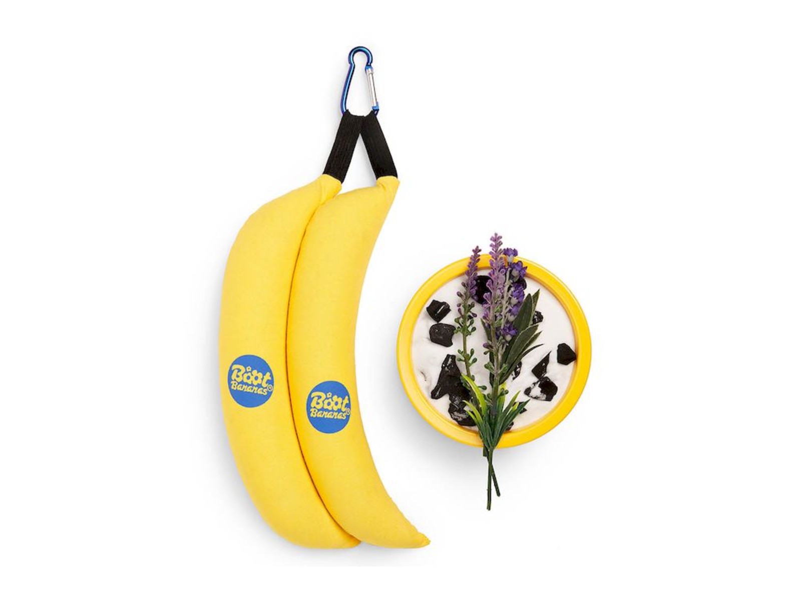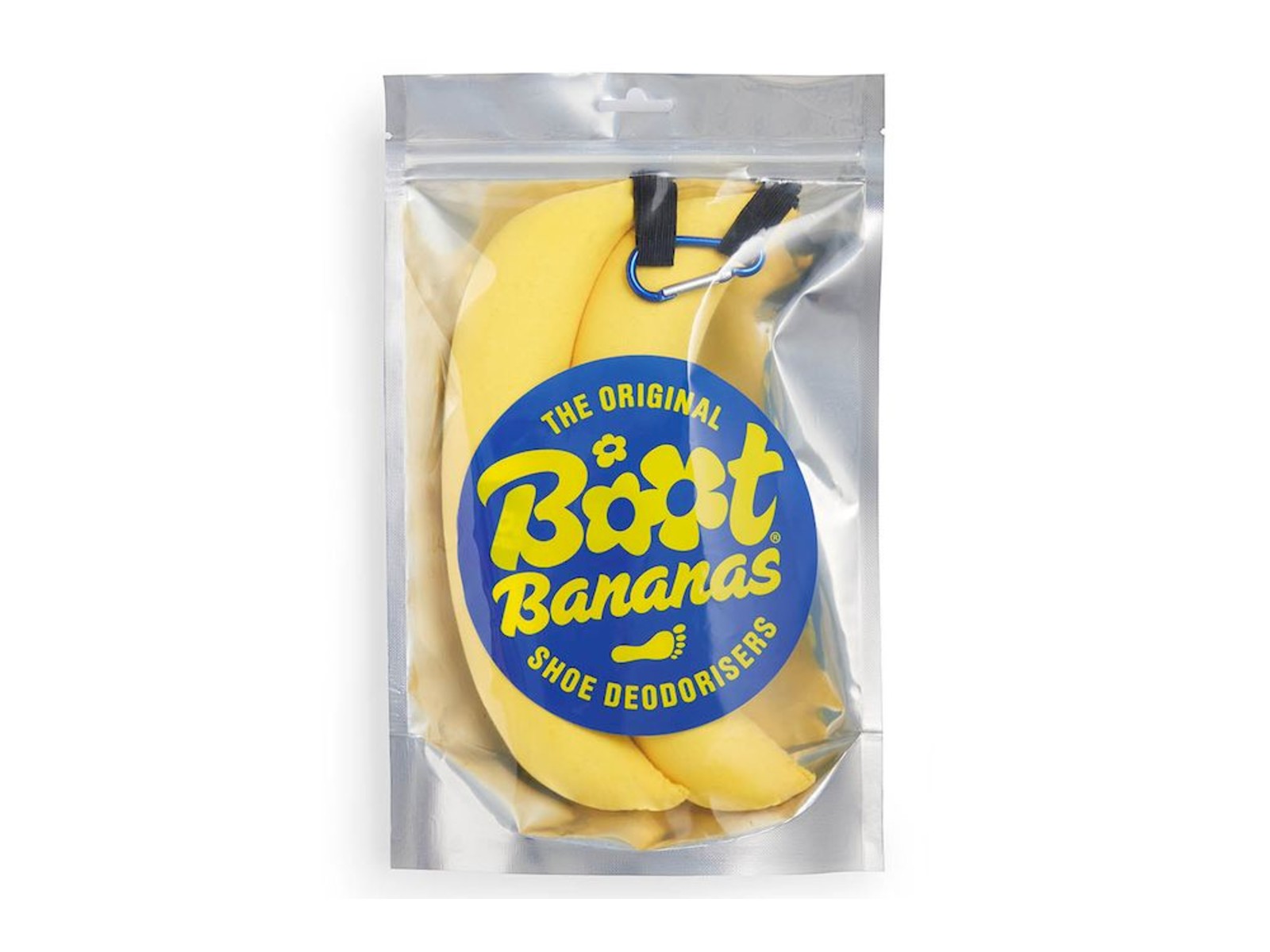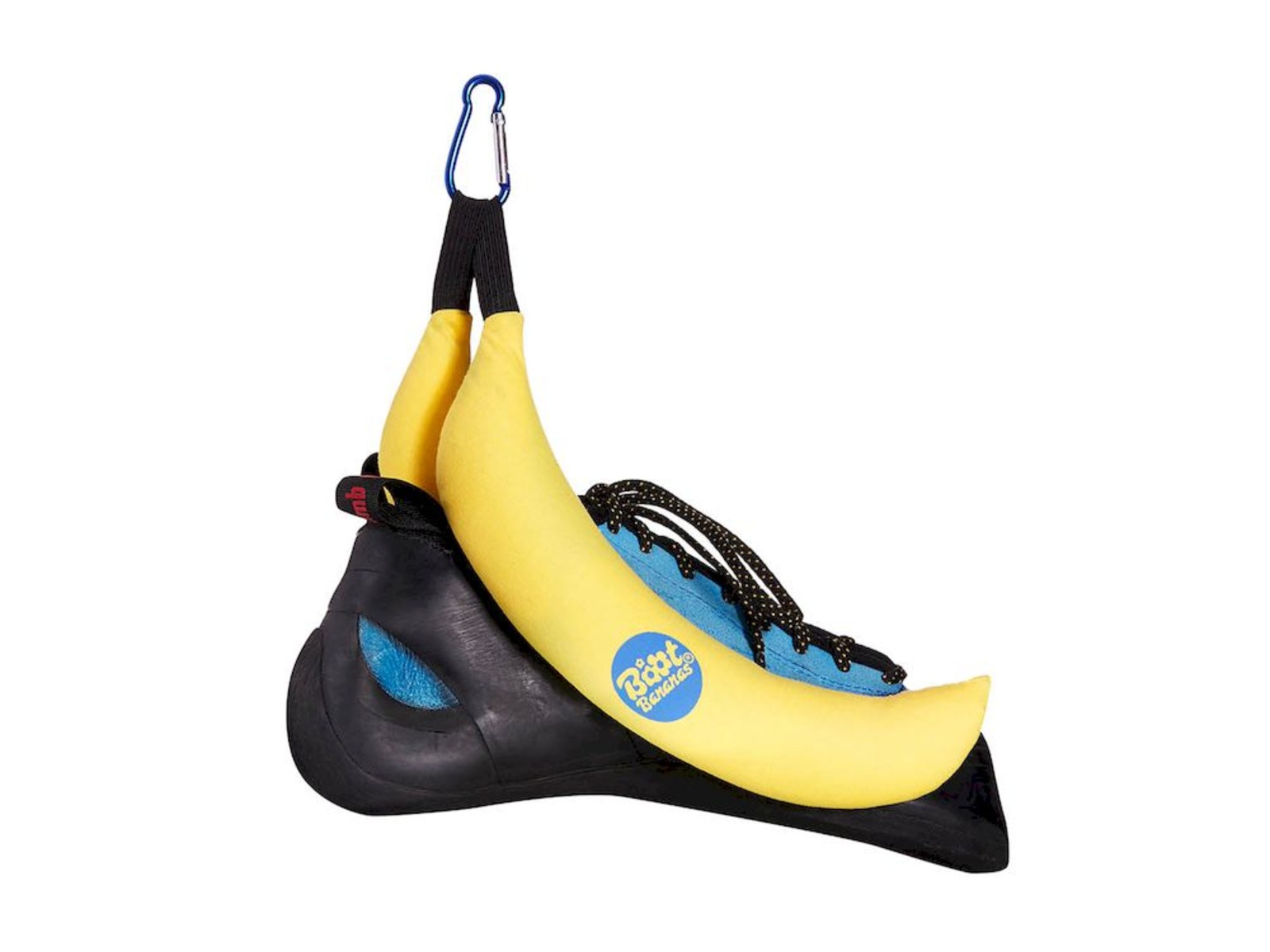 Duftende und feuchtigkeitsabsorbierende Schuhdesodorierer für Kletterschuhe, Laufschuhe oder andere "fruchtige" Schuhe. Boot Bananas werden aus natürlich absorbierenden Salzen, Mineralien und Pflanzenextrakten mit ätherischen Ölen aus Lavendel, Zitrone, Patchouli und Teebaum hergestellt, die in eine Bananenschale aus 100 % Baumwolle eingewickelt sind. Die Bananen einfach nch der Benutzung in die Schuhe stecken. Für die optimale Leistung am besten schon bei neuen Sportschuhen damit anfangen, um die Geruchsbildung von Anfang an zu verhindern. Die Deo-Bananen bleiben auch dann noch wirksam, wenn sie leicht braun geworden sind, aber dadurch zeigt sich wie "reif die Bananen sind!" – also wieviel Feuchtigkeit sie aufgenommen haben.