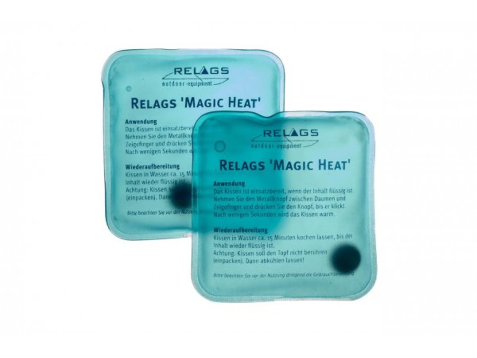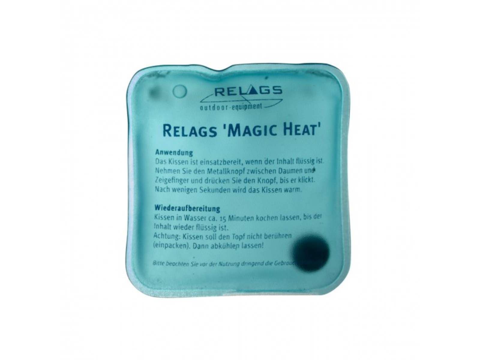 Magic Heat spendet wohlige Wärme auf Knopfdruck, wo Sie wollen. Die Wärme wird in dem Gelkissen durch Kristallisationsprozesse gespeichert und durch einen Druck auf den Metallknopf im Kissen langsam wieder abgegeben. Zur erneuten Benutzung wird das Gelkissen in einem Tuch verpackt (denn es darf nicht den Topfboden berühren) und mit kochendem Wasser wieder 'aufgeladen'. Nach ca. 15 Minuten im kochenden Wasser ist der Inhalt wieder flüssig und somit startbereit. Bei richtiger Anwendung (die Kissen sind naturgemäß gegen mechanische Beanspruchung etwas empfindlich) immer wieder verwendbar – bis zu einigen hundert Mal. Findet Anwendung bei allen Outdooraktivitäten, in der Freizeit oder beim Sport. Wärmt ca. 1h.