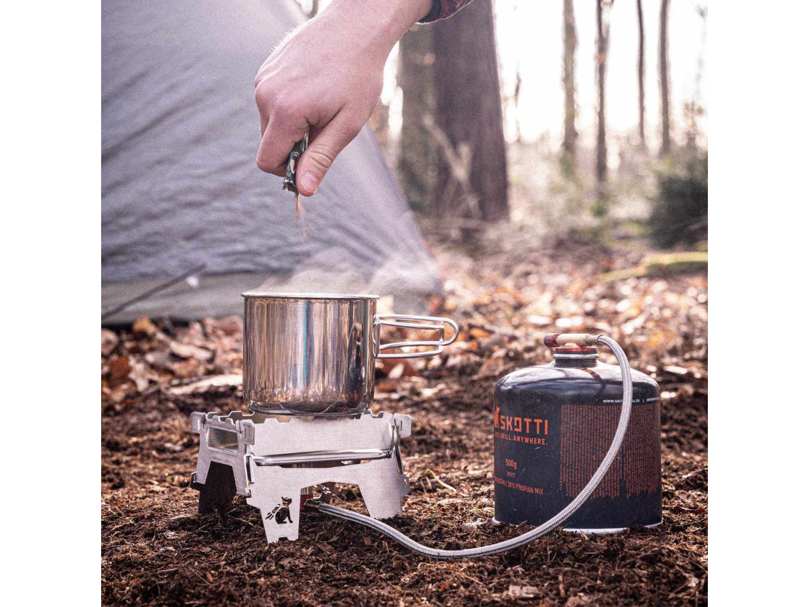 Der Skotti Booster überzeugt skottitypisch durch sein kleines, flaches Packmaß. Wie der große Skotti-Grill kann er mit wenigen Handgriffen klein zerlegt werden und nimmt so in seiner mitgelieferten robusten Packtasche wirklich wenig Platz ein. Das Material ist hochwertiger Edelstahl. Das macht den Booster zwar nicht zum ultimativen Leichtgewicht – er ist dafür sehr robust und wird lange halten. Dazu kommt der angenehm niedrige Schwerpunkt, der Kocher steht mit seiner breiten Standfläche und der großen Kochfläche von etwa 13 x 7,5 cm wie "eine Eins", auch größere Töpfe oder Pfannen können problemlos verwendet werden. Die Brennerleistung liegt bei 2.200 Watt, das ist nicht der höchste Wert aus unserem Kochersortiment – angesichts des kleinen Packmaßes aber sehr ordentlich und ausreichend um Mahlzeiten für die ganze Familie zubereiten zu können.