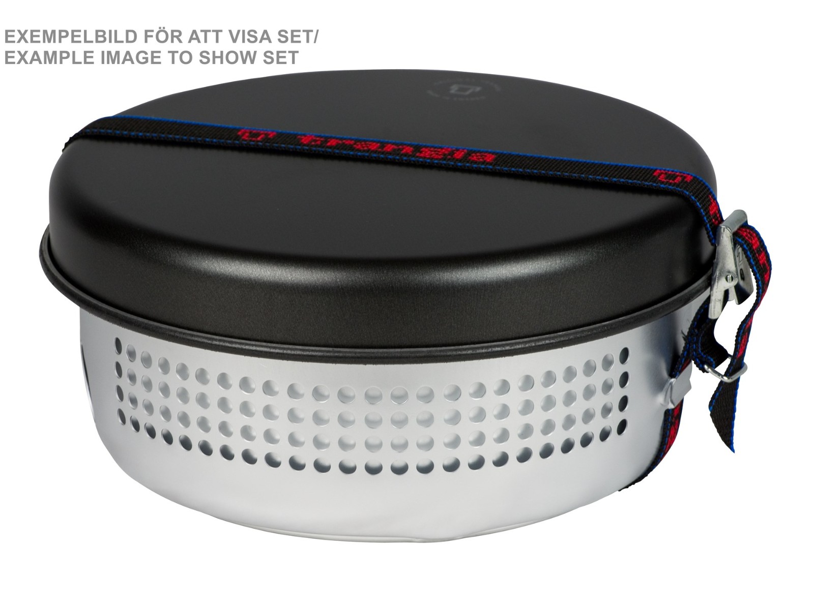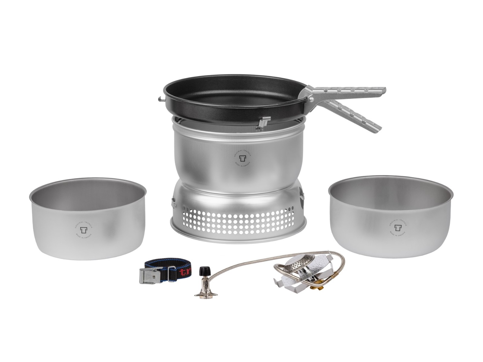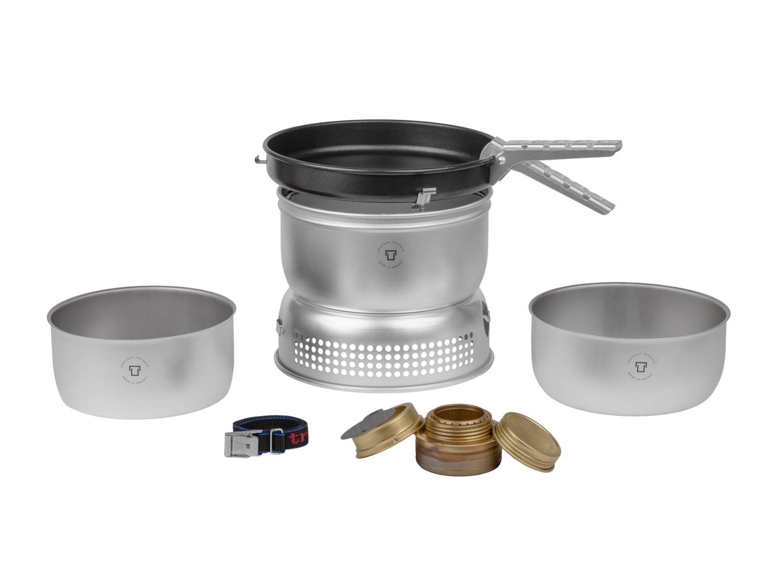 Original Trangia Spiritus-Brenner, Ultralight-Aluminium-Untergestell, Ultralight-Aluminium-Windschutz mit Topfhalterung, Brenner, 2 Töpfe mit 1,5 und 1,75 Liter Volumen, Pfanne 220 mm Ø, Griffzange und 68 cm Spanngurt.